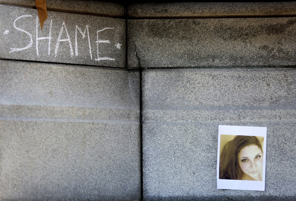 Nápis Hanba pri fotografii Heather D. Heyerovej, ktorú zabili v sobotu v Charlottesville. Foto - TASR/AP