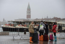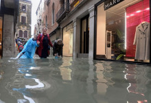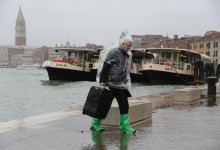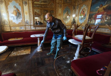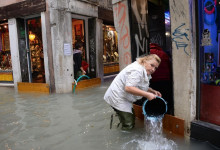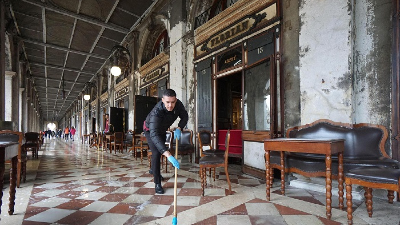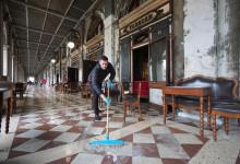 Muž sa snaží dostať vodu z historického Caffe Florian na Námestí sv. Marka v Benátkach. Foto - TASR/AP