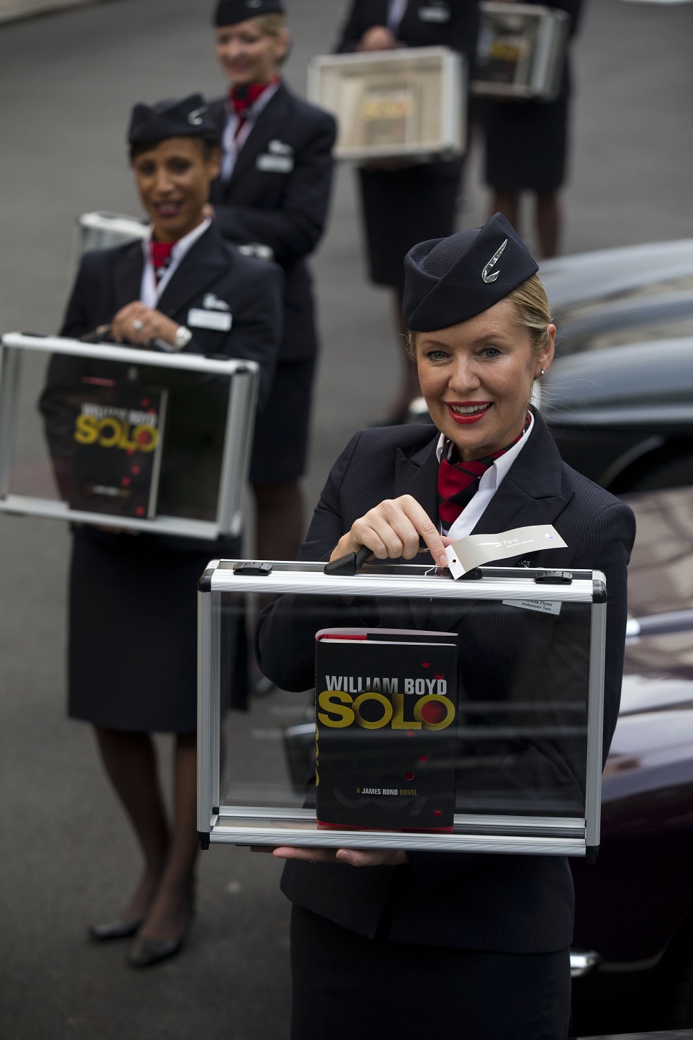 Britské letušky pózujú s novou oficiálnou "bondovku" pod názvom Solo pred hotelom Dorchester v Londýne v roku 2013.