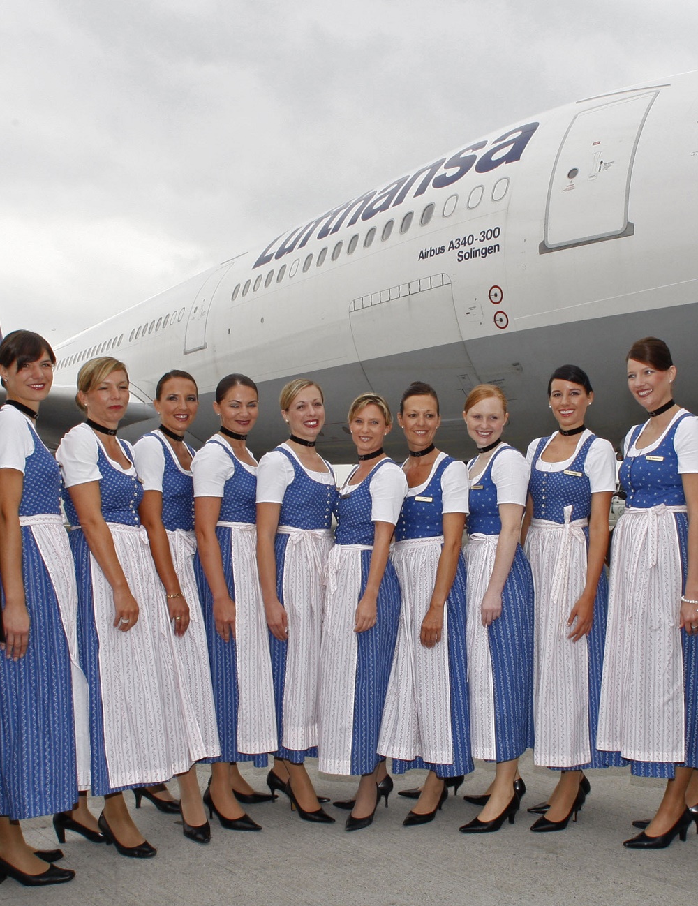 Letušky spoločnosti Lufthansa v tradičnom bavorskom oblečení "Blaudruck Dirndl" v roku 2008.