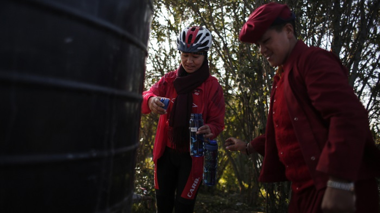 Budhistická mníška si napĺňa do fľaše vodu pred štartom mesačnej cykloturistickej púte. Foto - TASR/AP