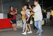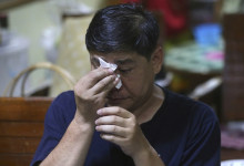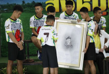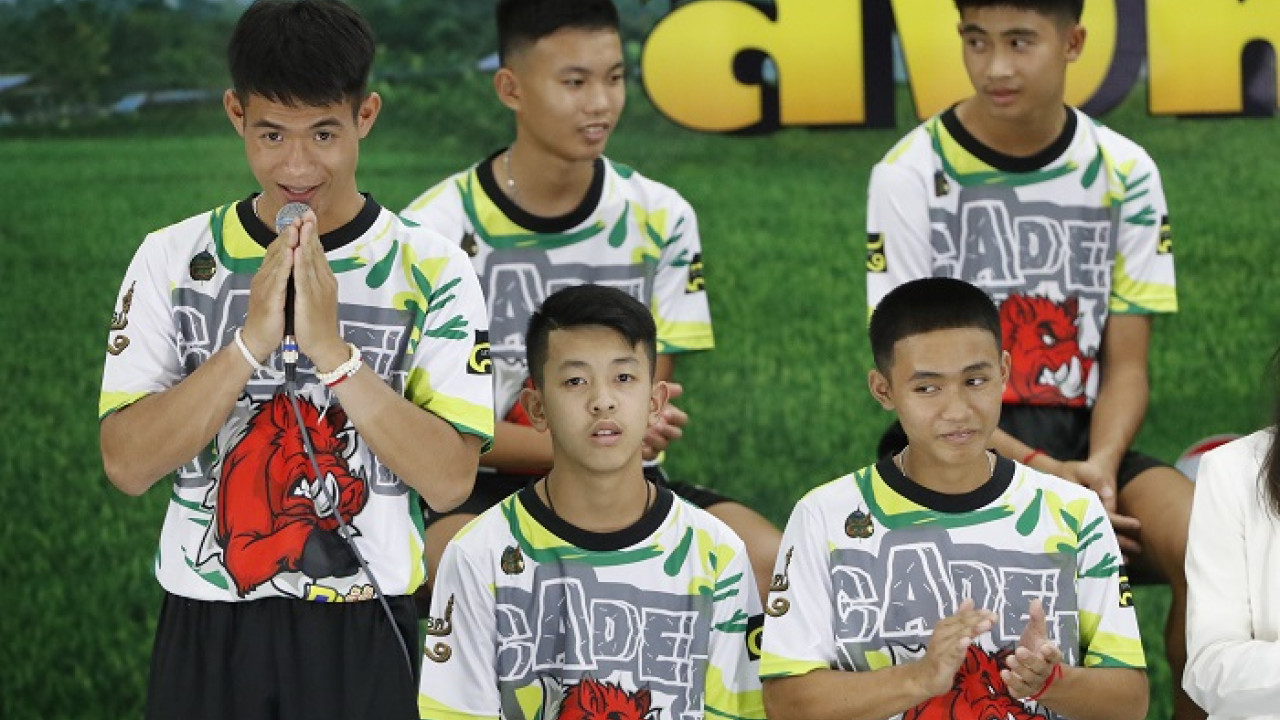 Tréner Ekkapol Janthawong (vľavo) so svojimi malými futbalistami na tlačovej konferencii po prepustení z nemocnice. So svojím 25-ročným trénerom, bývalým budhistickým mníchom, navštívili jaskyňu Tcham Luang po futbalovom tréningu 23. júna. Po náhlej povodni, ktorá zablokovala východ, tam zostali uviaznutí vyše dvoch týždňov. Chlapci boli hospitalizovaní v meste Čiang Rai, približne 60 kilometrov južne od jaskyne. Dnes ich pustili z nemocncie domov. Foto - TASR/AP