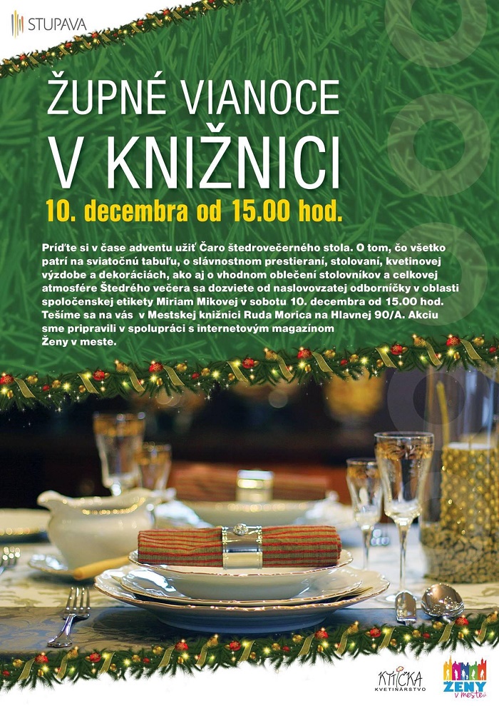 Posledná tohtoročná akcia bude vianočná. Lektorka spoločenskej etikety a biznis protokolu Miriam Miková nám povie, čo všetko patrí na štedrovečerný stôl, aké dekorácie a farby sú trendy, aké platia stolovacie zásady počas jedla, ako sa majú stolovníci obliecť, aby bola atmosféra Štedrého večera ako má byť. Vianočnú výzdobu predvedie aj Renáta Belzárová z kvetinárstva Kytička.
