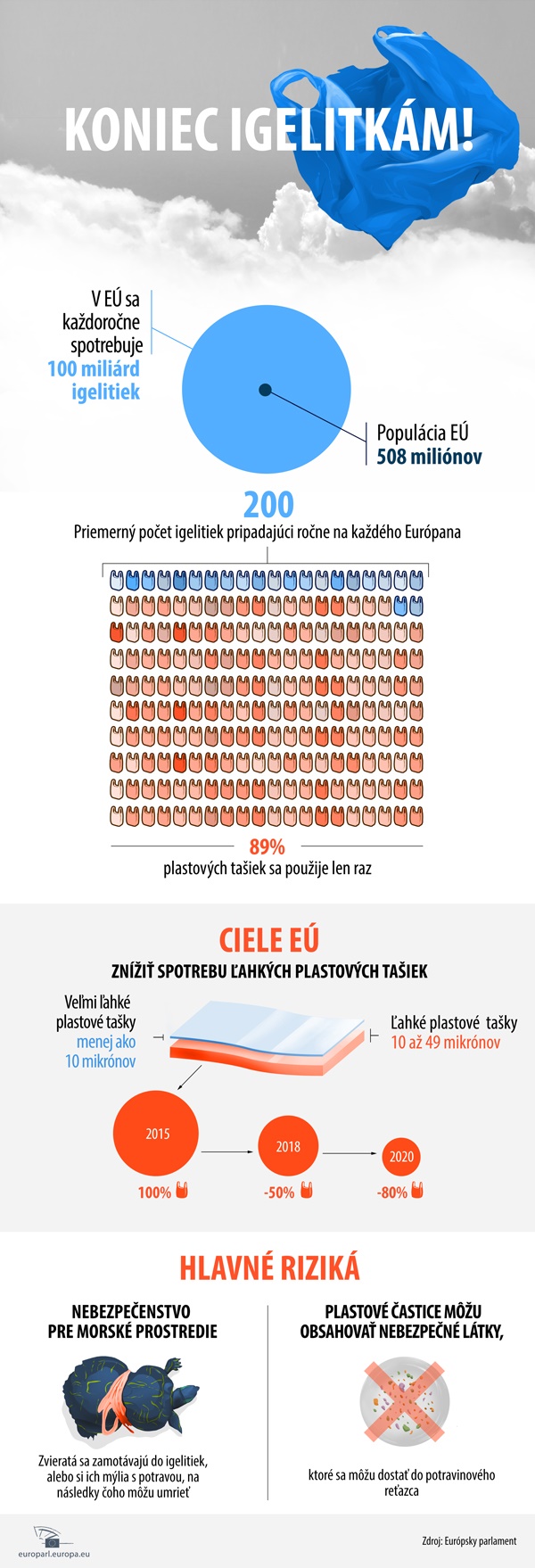 BRUSEL, BRATISLAVA. Európski poslanci schválili návrh, ktorý by mal drasticky obmedziť používanie igelitových tašiek v členských krajinách, vrátane Slovenska. Členské štáty majú podľa novej smernice znížiť ročnú spotrebu nerozložiteľných igelitových tašiek na 90 kusov na občana do roku 2019 a na 40 kusov do roku 2025. Ak takého opatrenia neprijmú, majú aspoň zabezpečiť, aby sa plastové tašky nerozdávali kupujúcim zadarmo. |