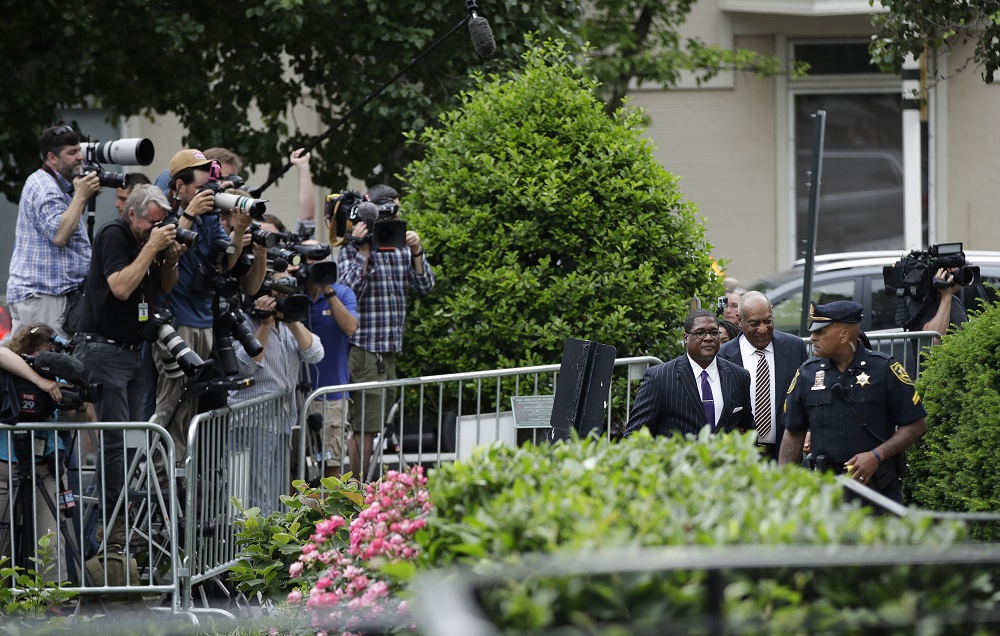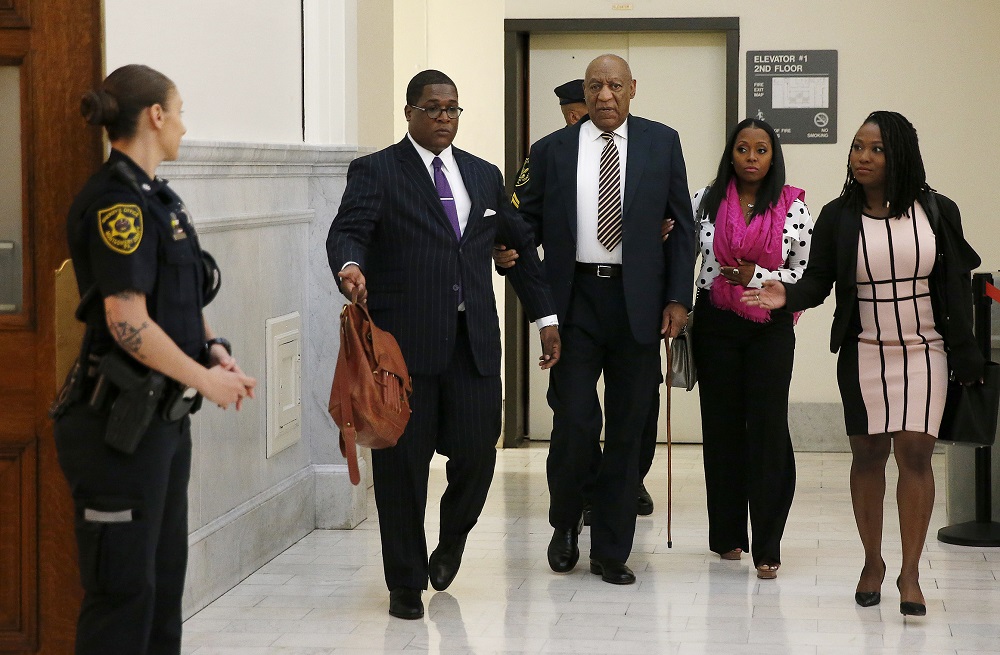 Prominentný obžalovaný sa pomalým krokom s paličkou v ruke a v tmavom obleku priblížil s úsmevom na tvári ku vchodu do súdnej budovy opierajúc sa o asistenta a Keishu Knightovú Pulliamovú - predstaviteľku svojej fiktívnej dcéry Rudy z populárnej The Bill Cosby Show. Na oslovenia prítomných predstaviteľov médií Cosby nereagoval.