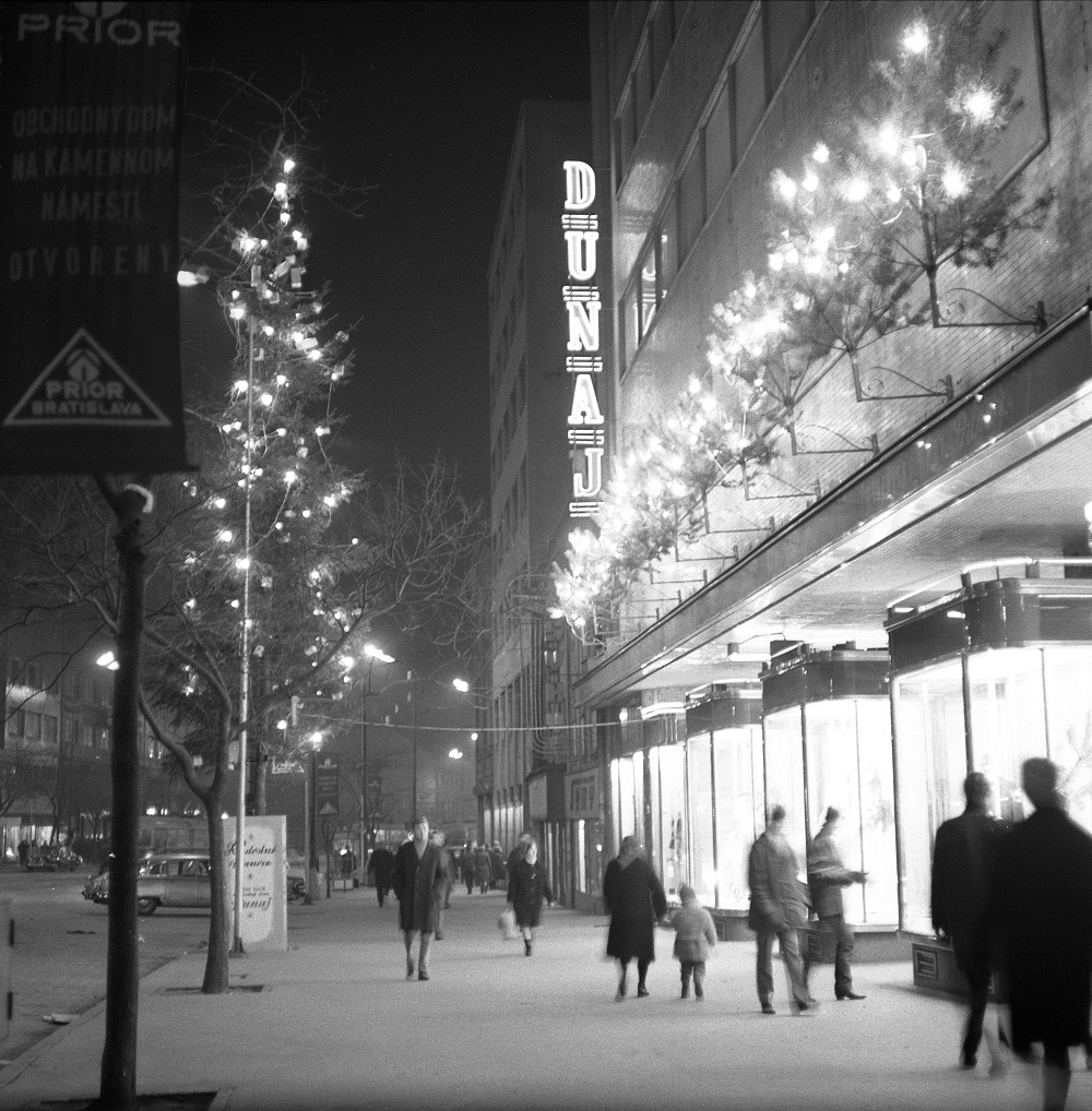 Na archívnej snímke z 17. decembra 1968 v Bratislave predvianočná nálada pred obchodným domom Dunaj a Domom obuvi. Foto TASR - Hradílek