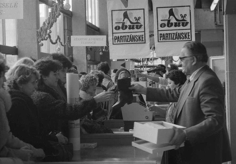Na archívnej snímke z 11. decembra 1984 predaj obuvi počas vianočných trhov v mestskej tržnici v Bratislave. Organizátori vianočného trhu na 2,5 tisícoch m2 štvorcových metrov ponúkali od 11. decembra žiadané textílie, odevy, drogistický tovar i potreby pre domácnosť. Foto TASR - Drahotín Šulla