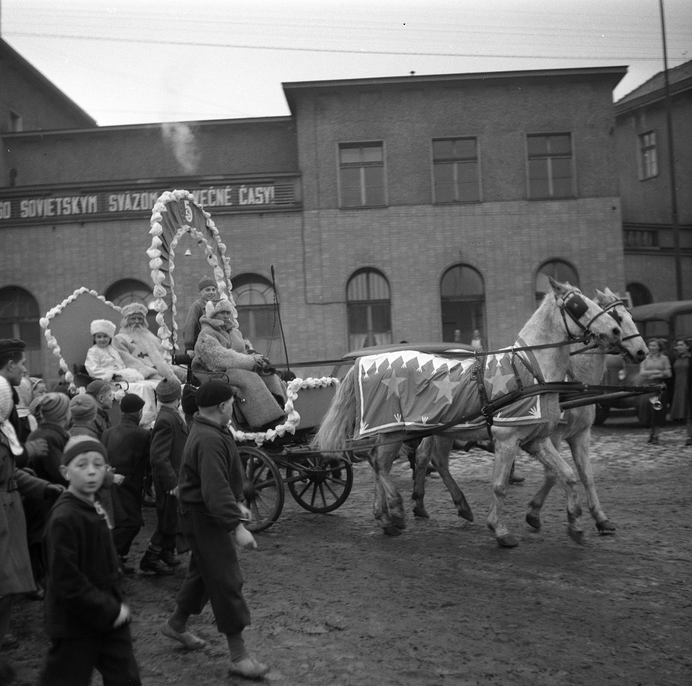 Na archívnej snímke z 31. decembra 1952 sprievod detí sprevádza Deda Mráza z hlavnej stanice ulicami Bratislavy. Foto TASR - Jozef Teslík
