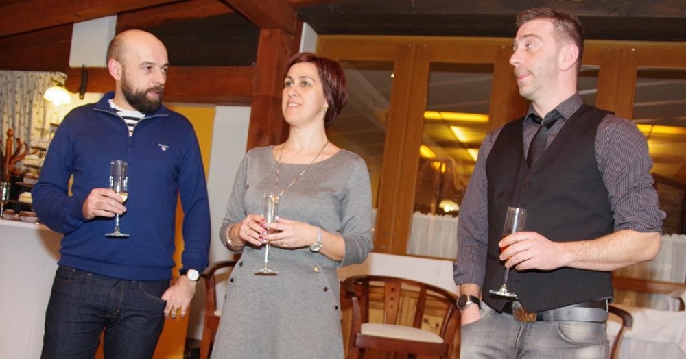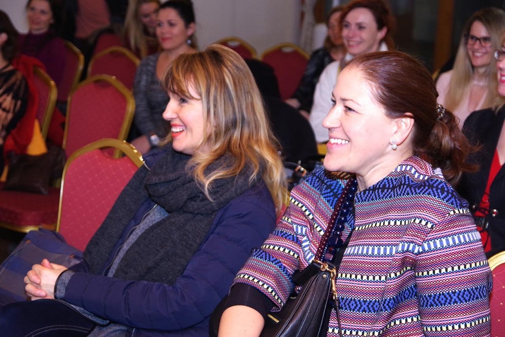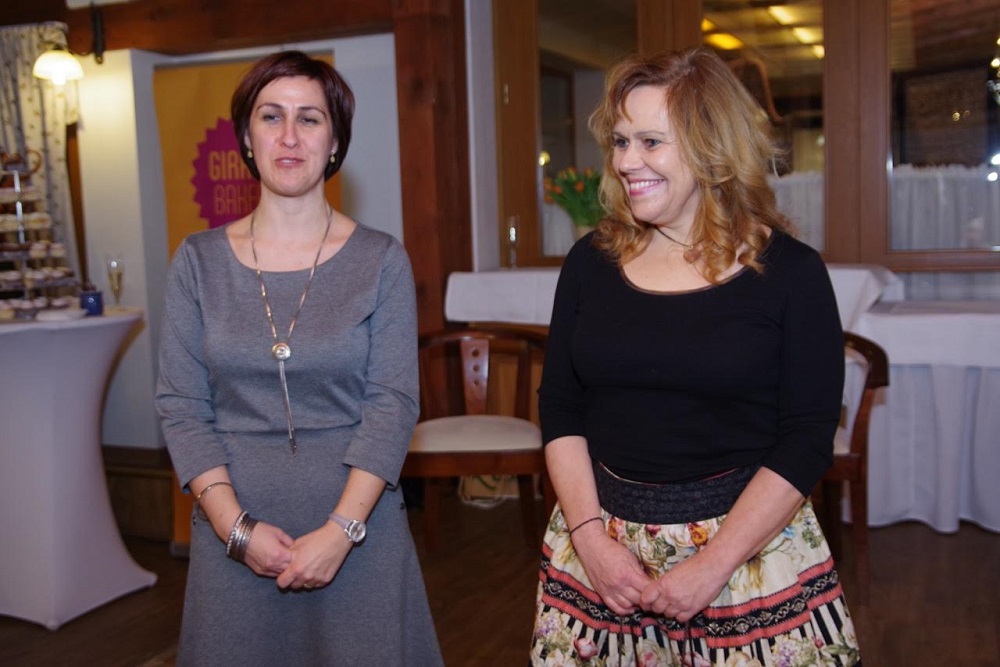 Šéfredaktorka portálu Miriam Zsilleová si s hosťami pripila na úspechy roku 2016: dvojnásobný počet zobrazení (takmer 1 800000), dvojnásobný počet užívateliek a užívateľov (takmer 750-tisíc), nomináciu na Novinársku cenu v kategórii Google za online inovatívnu žurnalistiku, kampaň Ženy, voľte ženy a vznik vyhľadávača expertiek Ženy inak, kde je dnes 127 odborníčok. Úspechom tiež bolo získať prvých mužov, ktorí pre Ženy v meste píšu stĺpčeky. Bývalí novinári a stand up komici Tomáš Hudák (vľavo) a Michael Szatmary (vpravo). Foto - Stano Stehlík