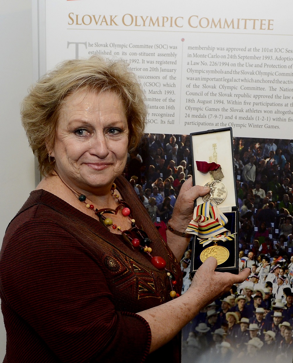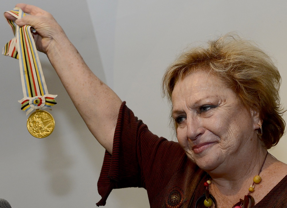 Věra Čáslavská v septembri 2013 v Bratislave so svojimi dvoma zlatými medailami z olympiád v Tokiu 1964 a Mexiku 1968, ktoré odovzdala do zbierky SZTK - Múzea telesnej kultúry v SR. Foto TASR - Martin Baumann