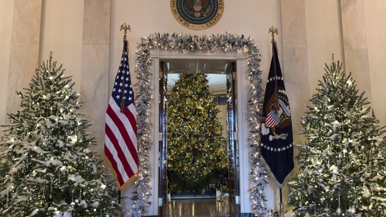 Vianočný stromček (uprostred) v Modrej izbe v Bielom dome - je to 5,5 metra vysoká jedlička s ozdobami, na ktorých sú pečate každého štátu a územia USA. Vianoce v štýle pani Trumpovej tvorí 71 vencov, 53 vianočných stromčekov, vyše 18.000 svetielok, viac ako 12.000 ozdôb, vyše 2800 metrov stuhy a okolo 300 metrov girlánd, informoval Biely dom.Foto - TASR/AP