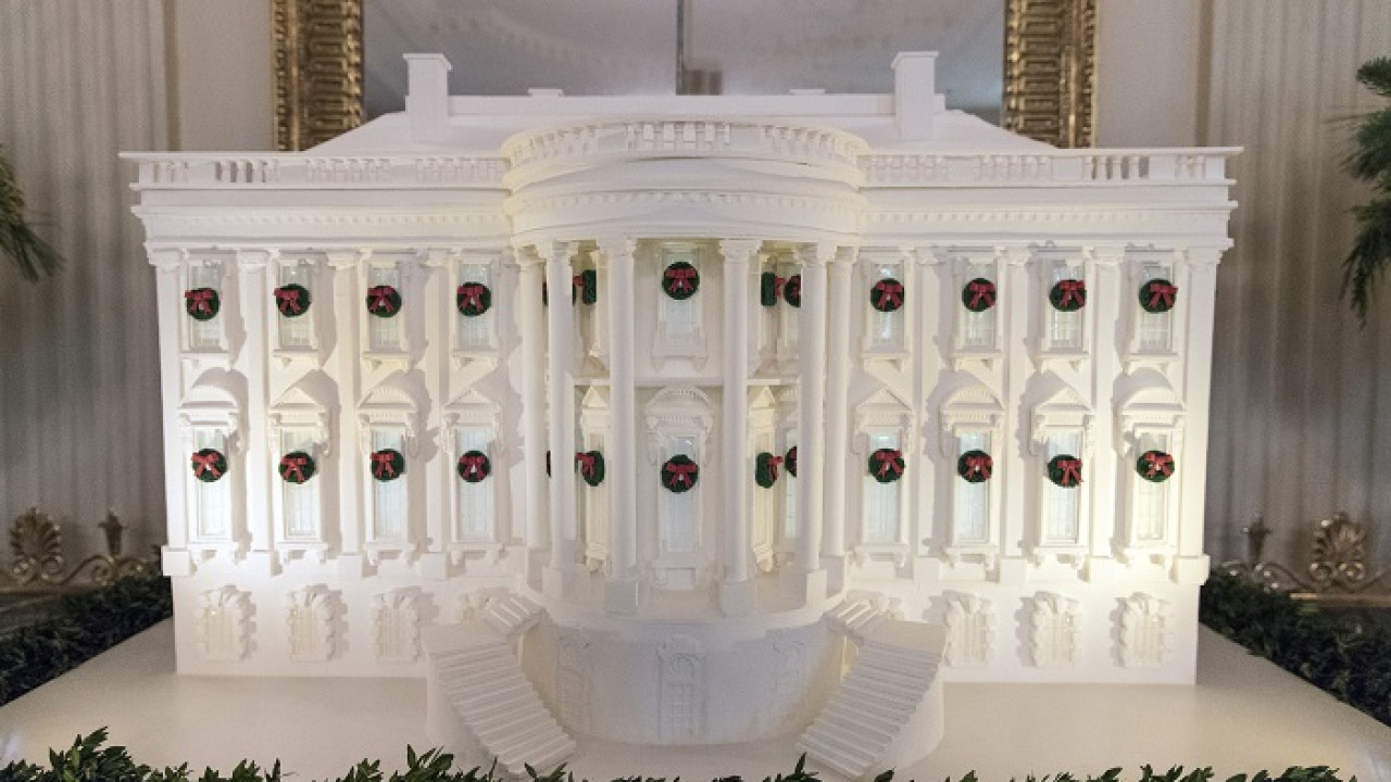 Medovníkový Biely dom v Štátnej jedálni počas prehliadky vianočnej dekorácie v Bielom dome. Až 159-kilogramový perníkový Biely dom ponúka tento rok pohľad na sídlo z juhu. Foto - TASR/AP