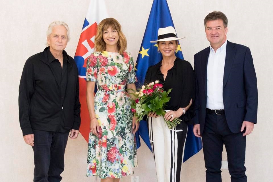 "Michaela Douglasa asi väčšina z Vás pozná ako výborného herca a ikonu americkej filmovej tvorby. Ako predseda Valného zhromaždenia OSN som mal minulý rok česť spoznať ho aj v trochu inej, diplomatickej úlohe. Ako mierový vyslanec OSN je totiž veľmi aktívnym podporovateľom politík odzbrojenia. Som veľmi rád, že som dnes mohol nadviazať na náš rozhovor v New Yorku a privítať Michaela aj s manželkou, herečkou Catherine Zeta-Jones v Bratislave. Catherine je aktívna v charitatívnych organizáciách, ktoré sa venujú ochrane práv detí vo svete. Rozhovor s nimi bol nesmierne zaujímavý a je skvelé, že svoj talent venujú aj pomoci deťom a mierovým cieľom OSN," napísal minister Lajčák na sociálnej sieti po stretnutí, ktoré sa uskutočnilo v historických priestoroch Palugyayovho paláca.