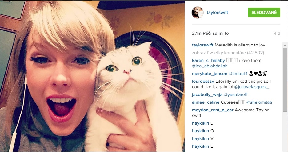 Americká speváčka Taylor Swift má na Instagrame rekordný počet fanúšikov – je ich 50 miliónov. „Ďakujem veľmi pekne, ľudia,“ napísala na svojom konte. „Som si takmer istá, že je to vďaka mojím sladkým mačkám,“ napísala s tým, že často dáva na Instagram fotky zvierat.