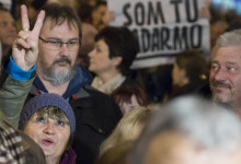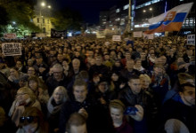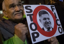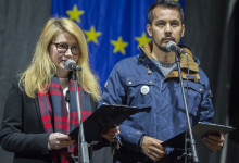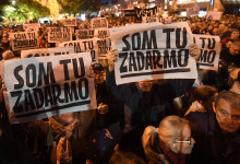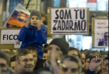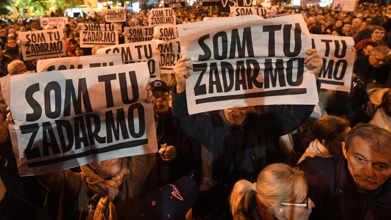 Ľudia na Námestí SNP v Bratislave držali transparenty Som tu zadarmo v reakcii na obvinenie, že protesty sú financované Sorosom. Foto TASR – Martin Baumann