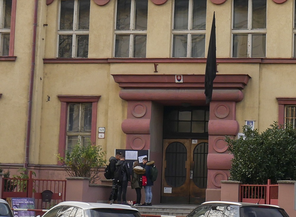 Žiaci stoja pred tabuľou pred Strednou odbornou školou (SOŠ) techniky a služieb v Nitre, na ktorej sú štyria študenti, ktorí zahynuli pri stredajšej zrážke autobusu a nákladného auta pri obci Malanta neďaleko Nitry. Foto TASR - Milan Ivanič