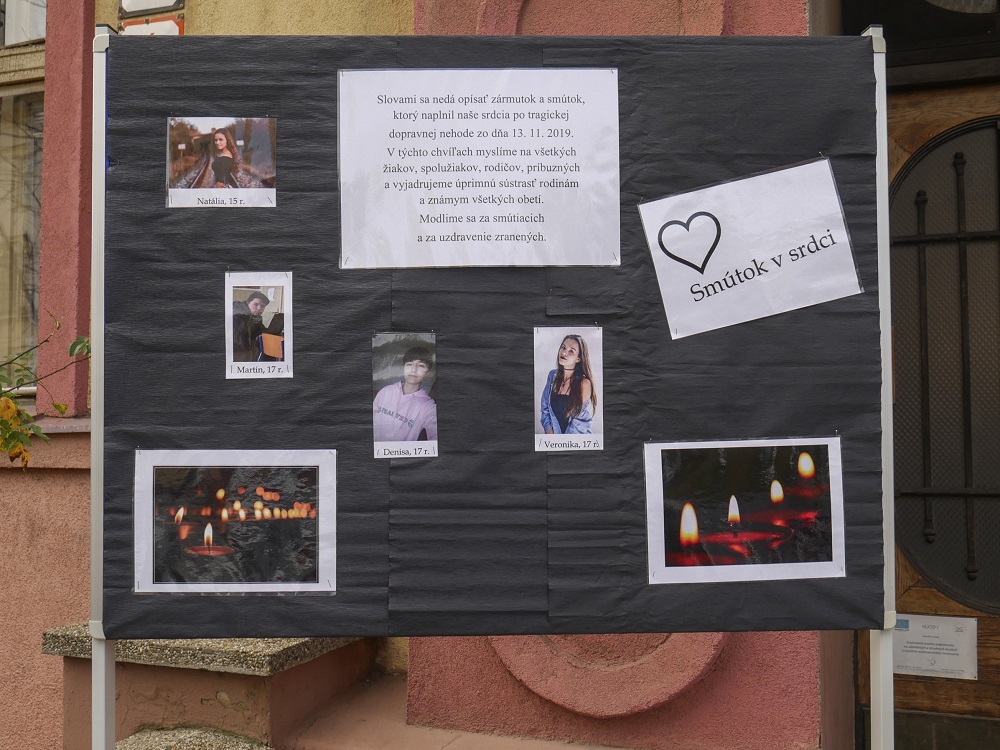 Tabuľa pred Strednou odbornou školou (SOŠ) techniky a služieb v Nitre, na ktorej sú štyria študenti, ktorí zahynuli pri stredajšej zrážke autobusu a nákladného auta pri obci Malanta neďaleko Nitry. Foto TASR - Milan Ivanič