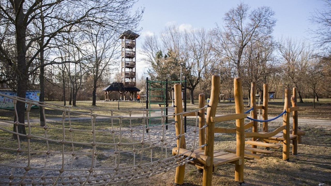 Detské ihrisko a v pozadí novootvorená rozhľadňa v lesoparku bratislavskej mestskej časti Vrakuňa. Foto TASR – Jaroslav Novák