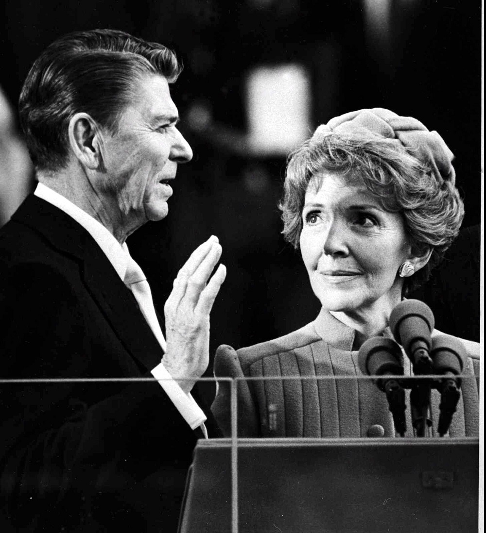 Nancy Reaganová sleduje svojho manžela Ronalda Reagana, ktorý skladá prezidentskú prísahu 20. januára 1981. Foto - TASR/AP