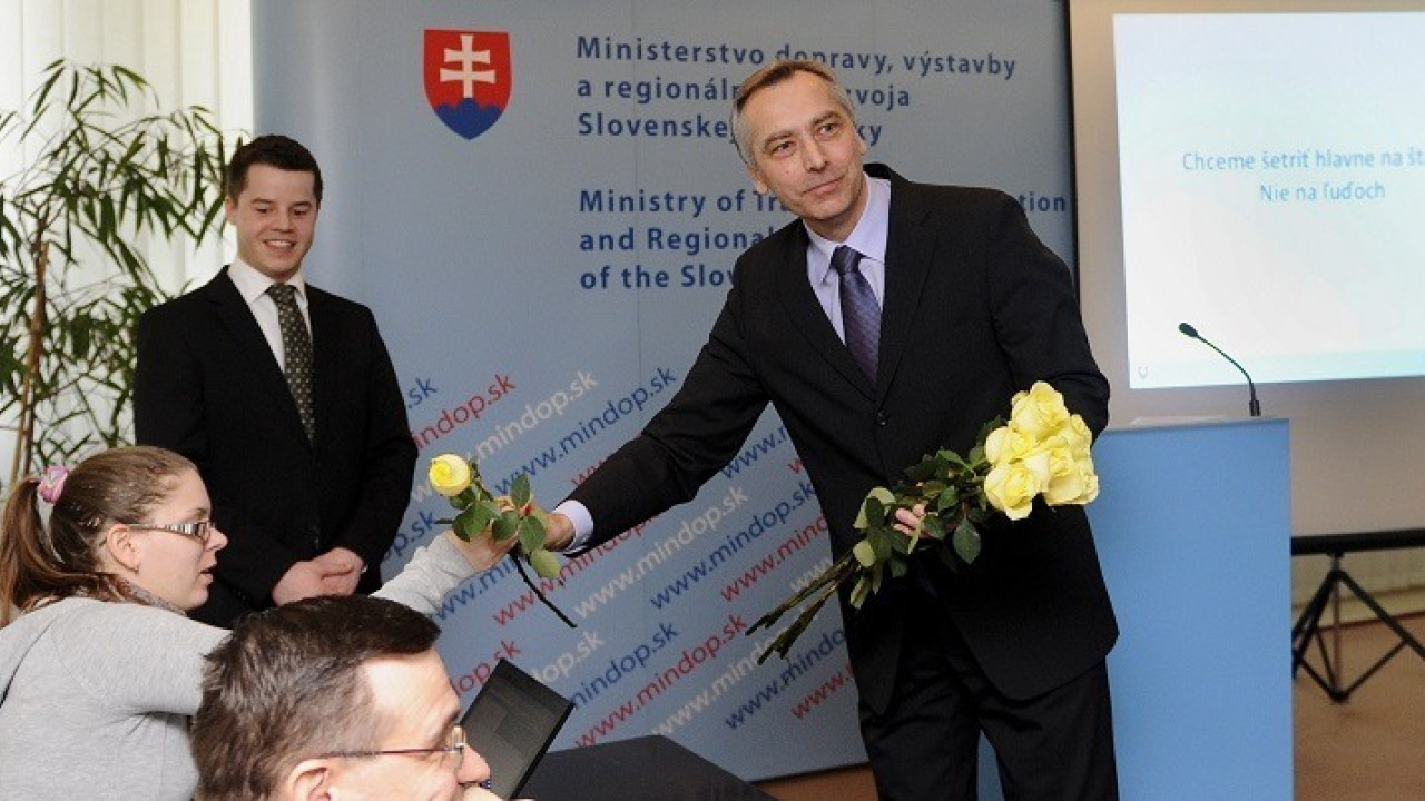 Na snímke minister dopravy, výstavby a regionálneho rozvoja SR Ján Figeľ počas tlačovej konferencie o ušetrení 1,5 miliardy slovenských korún 8. marca 2011 v Bratislave rozdal novinárkam ruže k MDŽ.