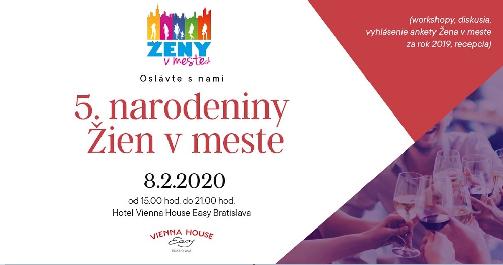 Oslavy narodenín v hoteli Vienne House Easy začneme sériou menších diskusií a workshopov v čase od 15:00 hod - 18:00 hod., potom nasleduje hlavný program: Hlavná diskusia, vyhlásenie ankety Žena v meste za rok 2019 a recepcia.