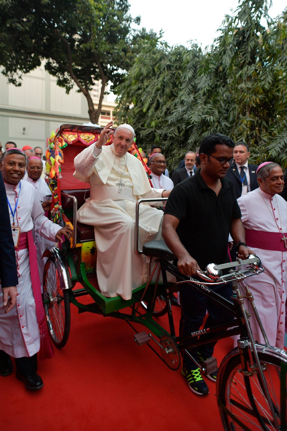 DHÁKA. Pápež František vymenil v piatok na návšteve bangladéšskej metropoly Dháka svoj papamobil za rikšu, vozík ťahaný človekom na bicykli, ktorý je v tejto časti Ázie typickým dopravným prostriedkom. František mával davom ľudí zo zadného sedadla rikše, keď sa viezol ulicami na ekumenické stretnutie zástupcov rôznych kresťanských cirkví, hinduistov aj budhistov, ktoré sa konalo v záhrade rezidencie arcibiskupstva v Dháke.