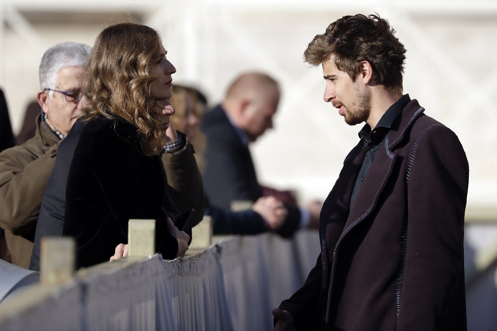 Trojnásobný majster sveta v cyklistike Slovák Peter Sagan a jeho manželka Katarína Saganová prichádzajú na pravidelnú generálnu audienciu na Námestí sv. Petra vo Vatikáne 24. januára 2018. Foto - TASR/AP