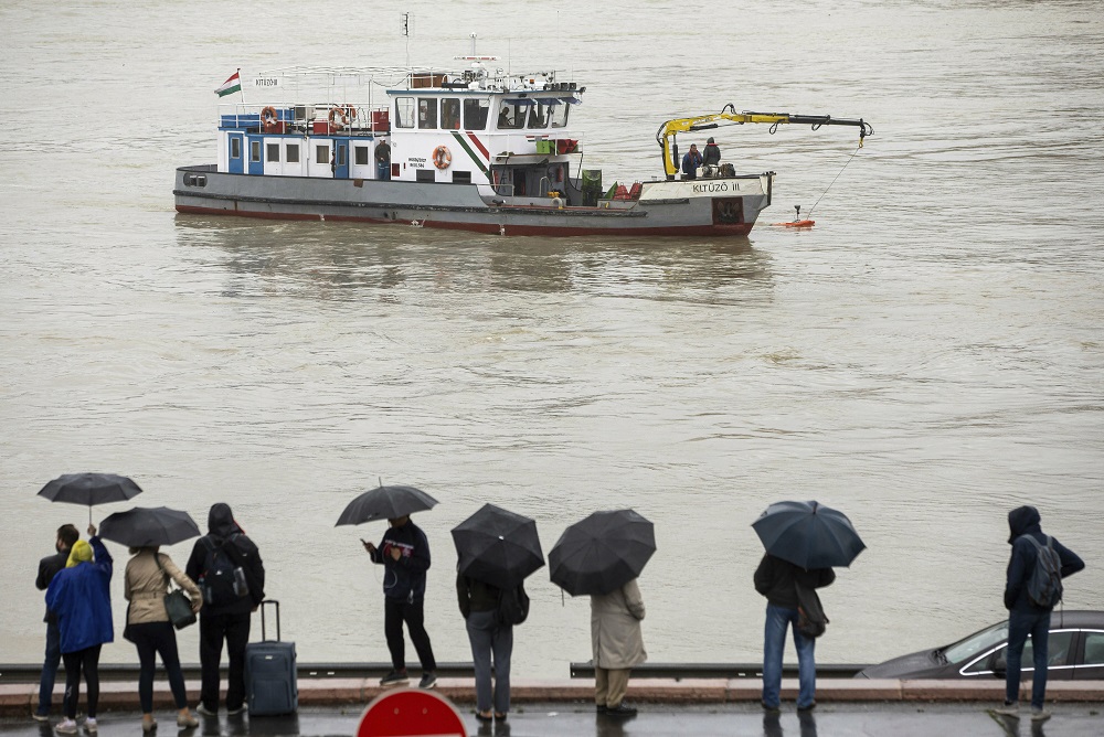 Ľudia sa pozerajú z Margitinho mosta na záchranársku loď, ktorá používa sonar počas záchrannej operácie na Dunaji v Budapešti. Foto - TASR/AP