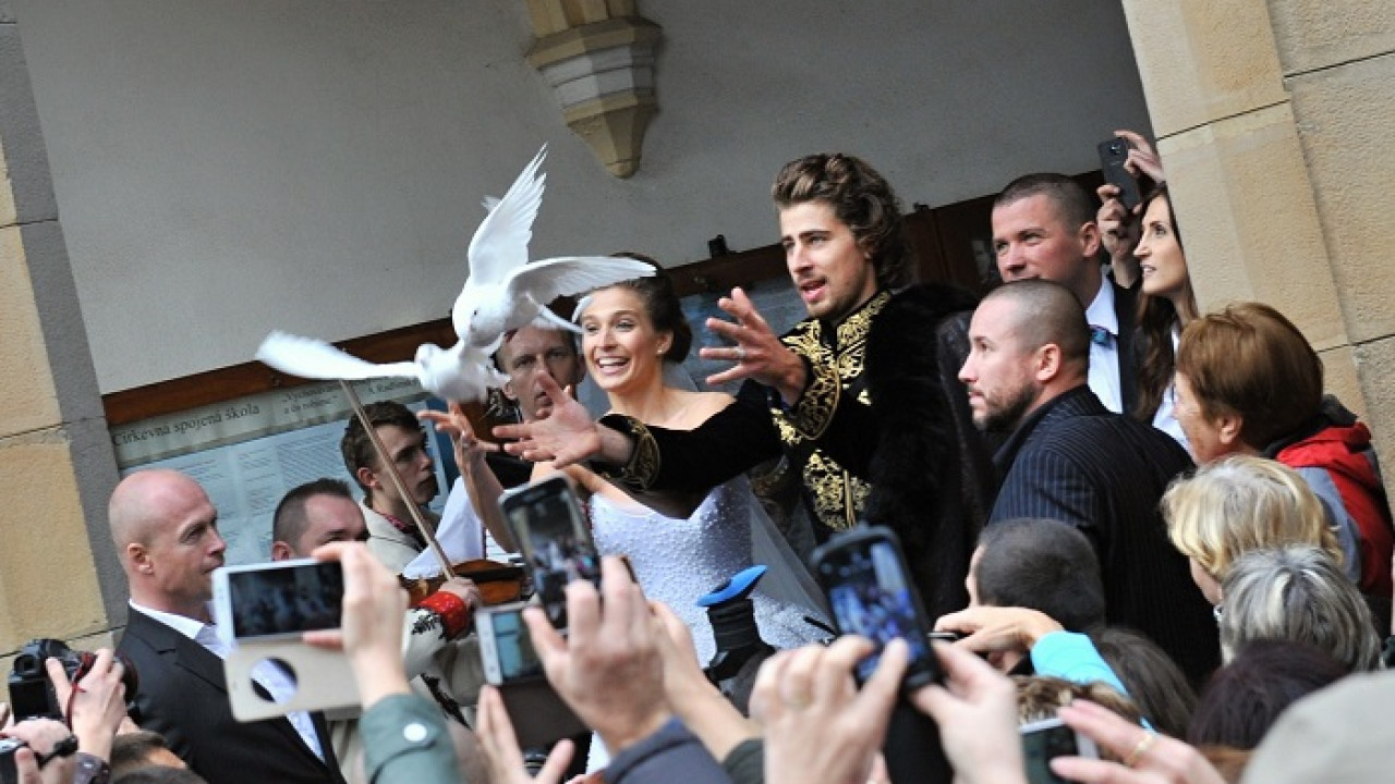 Peter Sagan a jeho manželka Katarína vypustili holubice po svadobnom obrade v rímsko-katolíckom kostole v Dolnom Kubíne 11. novembra 2015. Foto TASR - Erika Ďurčová