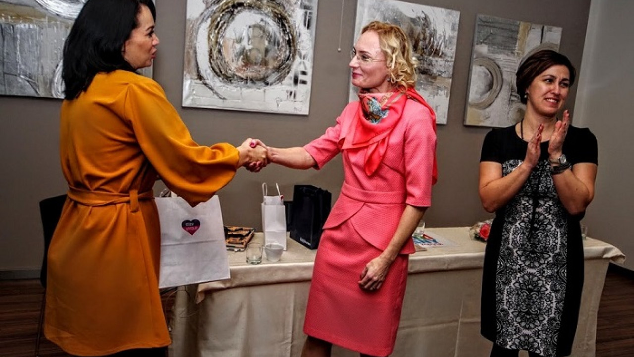 Hlavnú cenu víťazke a Žene v meste za rok 2017 Katke Dikovej Strýčkovej odovzdala zakladateľka kozmetickej značky StayUnique Eva Vozárik, ktorá povedala niekoľko zaujímavých myšlienok o tom, ako by sa mali ženy podporovať. Foto - Stano Stehlík