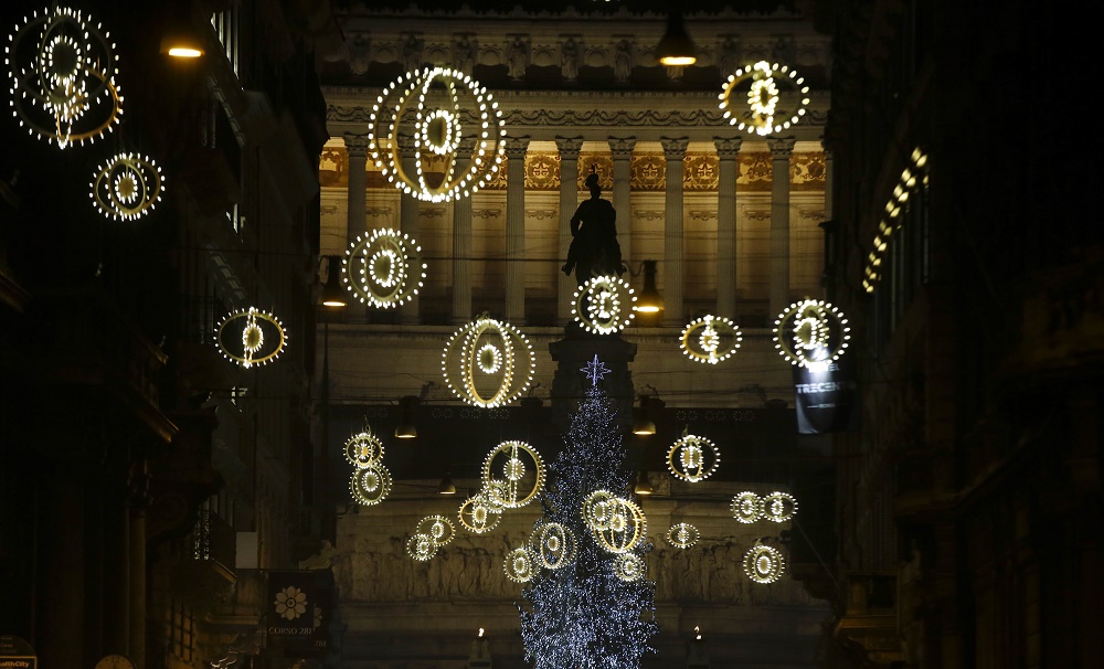 Vianočné osvetlenie a osvetlený vianočný strom zdobia pomník Viktora Emanuela II. v Ríme.