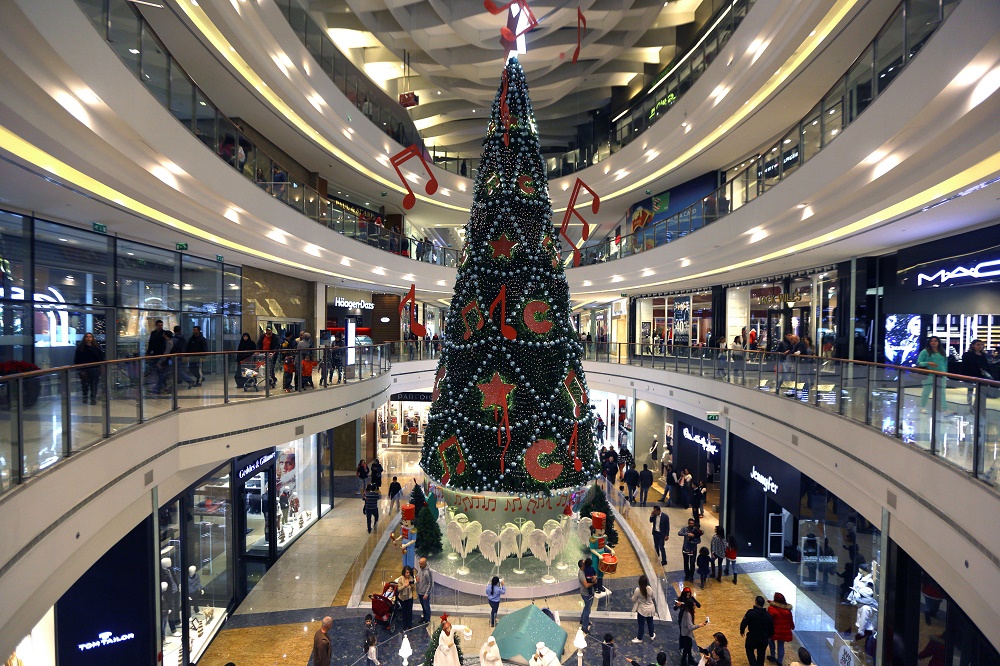 Vianočný strom vystavený v obchodnom centre v Bejrúte v Libanone.