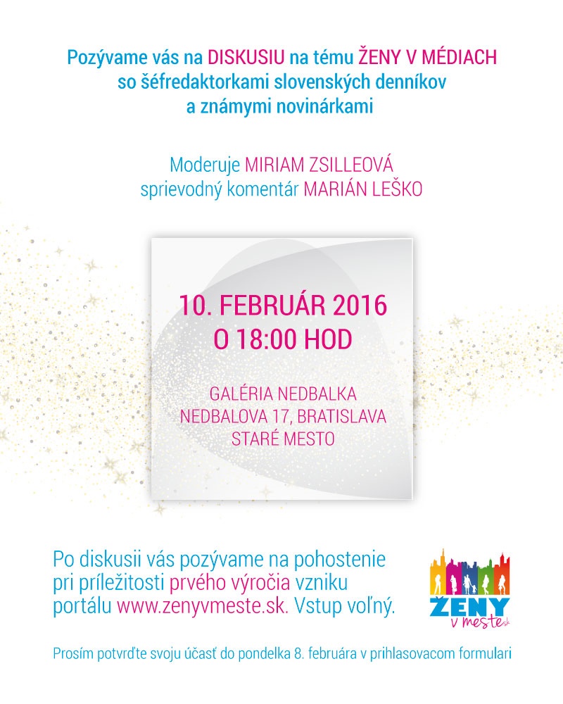 Nielen o týchto otázkach sa budeme rozprávať so šéfredaktorkami a významnými novinárkami v diskusii na tému Ženy v médiách, ktorá bude 10. februára 2016 v Galérii Nedbalka o 18.00 hod.