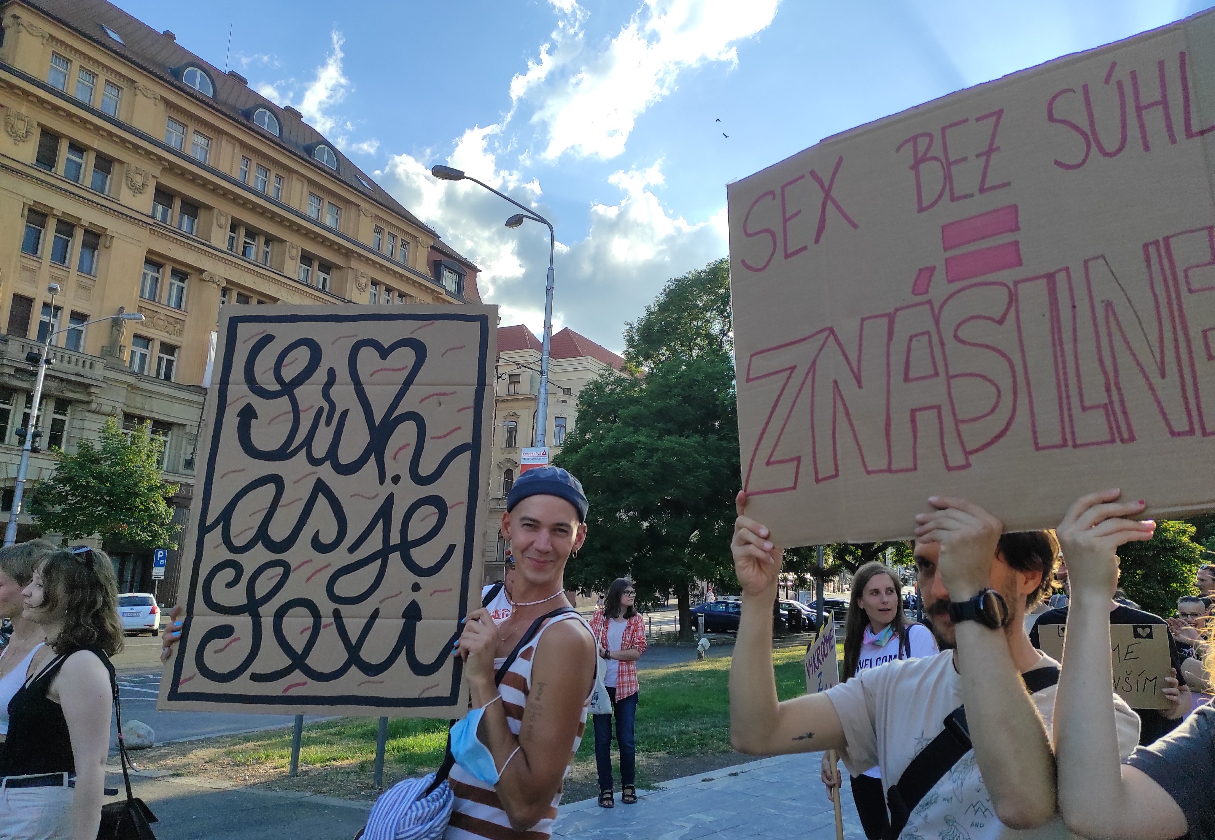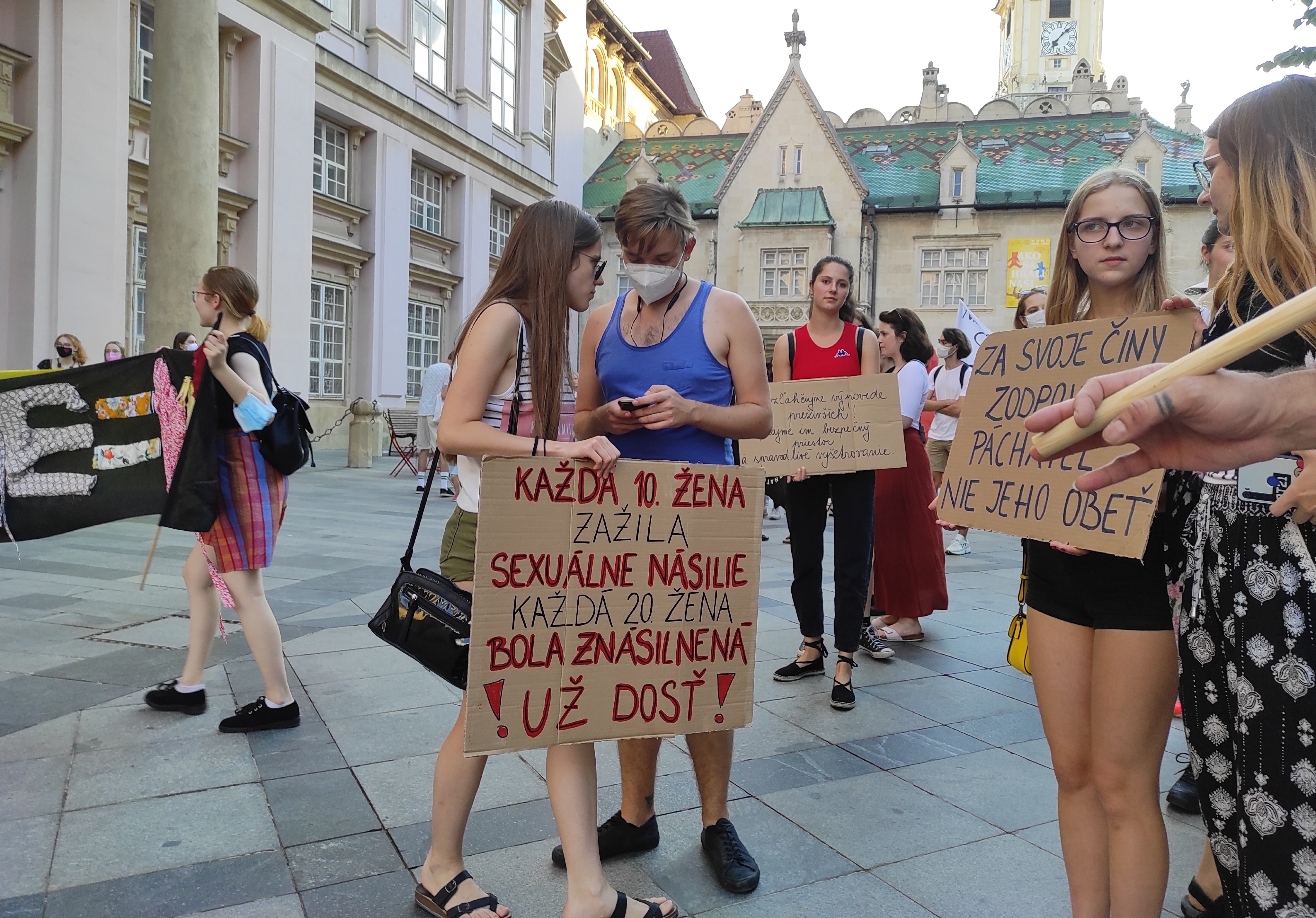 Na námestí SNP v Bratislave sa postupne zhromažďujú ľudia. Aby sa skryli pred horúcim slnkom, postávajú v tieňoch okolitých stromov a čakajú na oficiálny začiatok podujatia. Organizátorka Protestu proti sexualizovanému násiliu Alexandra Demetrianová z Amnesty International Slovensko, energeticky usmerňuje prichádzajúcich a pritom z ruky nepúšťa megafón.