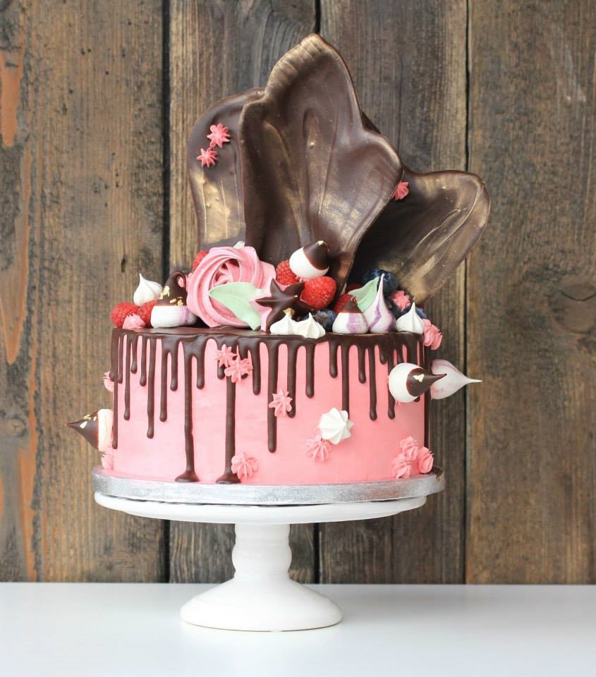 14. Vychladenú tortu celú okolo namažte luxusným maslovým krémom a nechajte zase chvíľu odležať v chladničke. Na záver polejte čokoládovou polevou a hore naukladajte, čo máte práve po ruke. Farebné pusinky, kúsky čokolády, cukríky, oriešky, jedlé kvety... vašej fantázii sa medze nekladú. Vylaďte si svoj PunkArtovú tortu podľa seba.