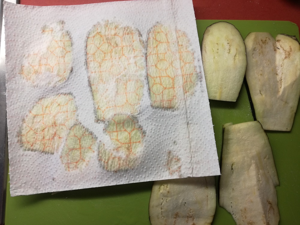 - Na začiatok nakrájame baklažán na tenké približne pol milimetrové plátky. položíme ich na podložku, osolíme a necháme min. 10 min "vypotitť", aby baklažán nebol horký. To isté spravíme aj z druhej strany. Vreckovkou potom poutierame plátky.