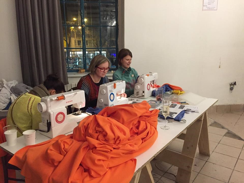 Dana Kleinert (v strede) šije nosiče pre deti utečencov.