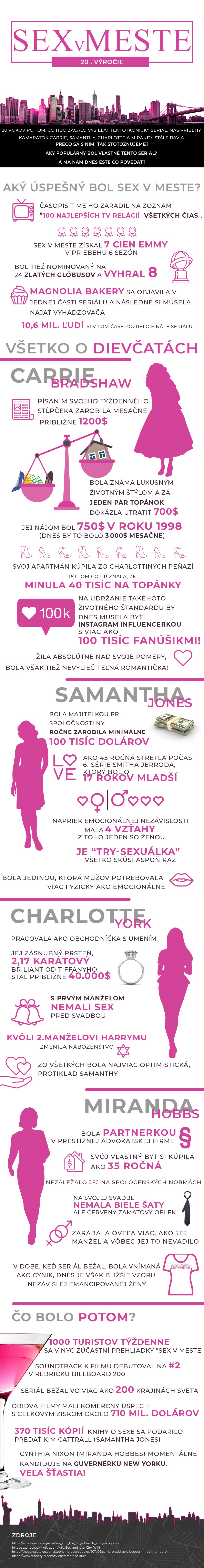Tí sa našli aj v tíme ShopAlike, kde pri príležitosti 20. výročia seriálu pripravili špeciálnu infografiku. V tej nájdete množstvo zaujímavých faktov o seriáli a jeho hlavných predstaviteľkách. Chcete napríklad vedieť, či by si Carrie skutočne mohla dovoliť všetky tie topánky? Aký realistický bol jej životný štýl? A prečo Miranda, ktorá nebola najobľúbenejšou postavou v dobe, keď seriál bežal, je dnes vzorom pre ženy? Odpovede na tieto a mnohé ďalšie zaujímavé otázky nájdete v infografike. Zaspomínajte si s nami.