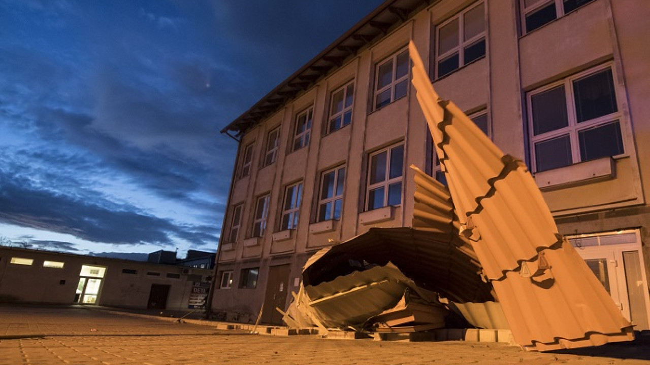 Silný vietor strhol strechu na súkromnej škole na Borinskej ulici v Bratislave Lamači. Foto TASR - Martin Baumann