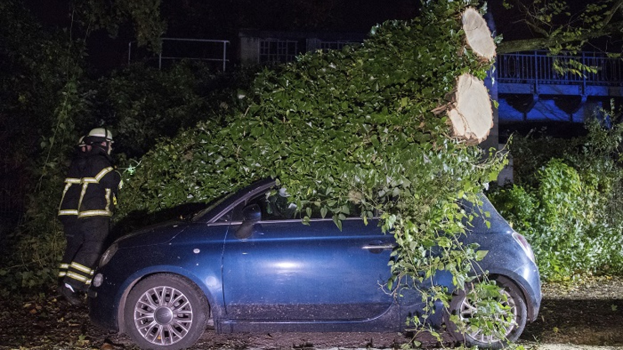 Hasiči odstaňujú spadnutý strom na auto v Hamburgu. Silný vietor napáchal škody na celom území severného a východného Nemecka. Foto - TASR/AP