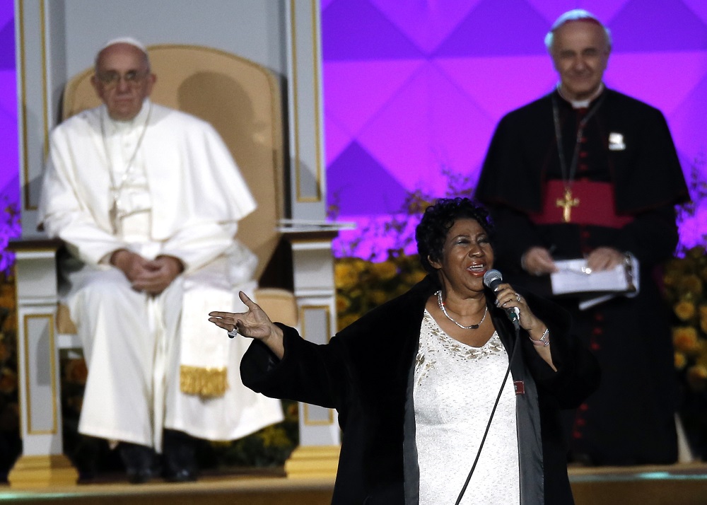 Aretha Franklinová počas festivalu rodín v roku 2015 vo Filadelfii. V pozadí vľavo pápež František. Foto - TASR/AP