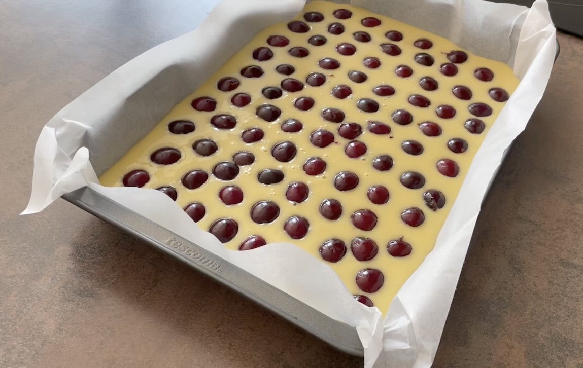 Cesto vylejeme do vymastenej a múkou vysypanej formy na pečenie. Na vrch cesta rovnomerne rozložíme ovocie, ktoré môžeme mierne zatlačiť do cesta.