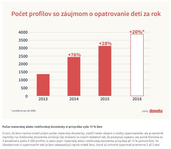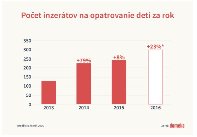 Ponuky na opatrovanie detí pritom výrazne rastú už od roku 2013. V roku 2014 sa počet ponúk zdvojnásobil a odvtedy rastie ročne v priemere asi o štvrtinu. V prípade zachovania tohto trendu počíta Domelia.sk v tomto roku s nárastom ponúk na opatrovanie detí o 23 percent.