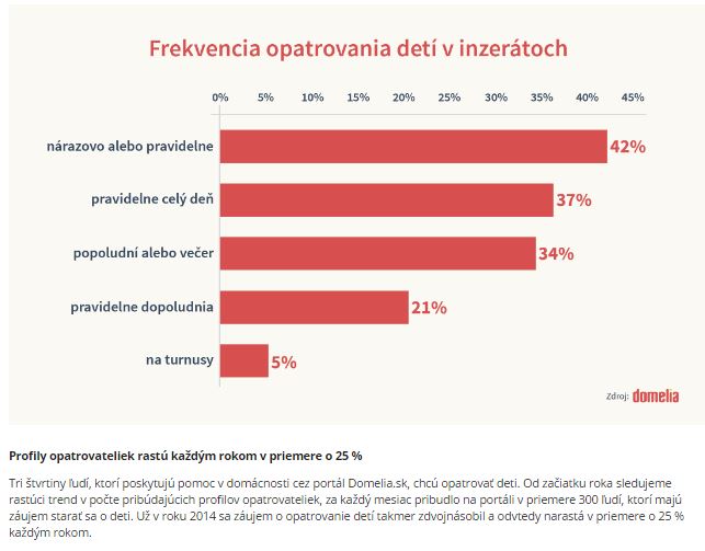 BRATISLAVA. Za posledné roky neustále stúpa záujem o služby opatrovateliek. Nájsť si niekoho na pár hodín, keď si rodičia potrebujú niečo vybaviť, nakúpiť či pracovať, je už oveľa bežnejšie ako pred pár rokmi. Bežné je aj večerné stráženie detí, sprevádzanie na krúžky či opatrovanie v prípade choroby. Výnimkou už nie je ani dlhodobé pravidelné opatrovanie. Ukázali to dáta portálu Domelia.sk.