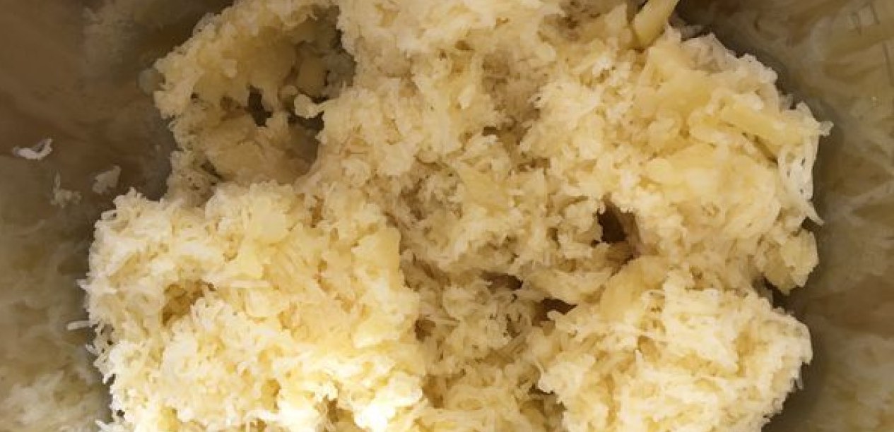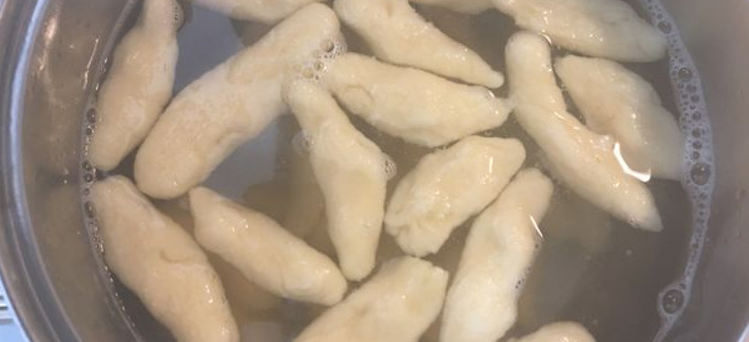 - Zemiaky aj so šupkou necháme variť až kým nezmäknú (približne pol hodiny). Necháme ich vychladnúť - cesto sa spracúva, až keď sú zemiaky studené. Uvarené zemiaky sceďte a pretlačte cez strúhadlo na zemiaky, alebo ich rozdrvte vidličkou.
