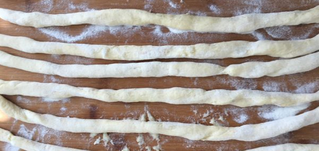 - Na pomúčenej doske rukami vytvarujte z cesta valček hrubý približne 2 cm. Valček nakrájajte na menšie kúsky, ktoré pomocou ruky stlačíte a vytvarujete do tvaru šúľancov. Znie to ako komplikovaná robota, ale v skutočnosti to je raz-dva hotové.