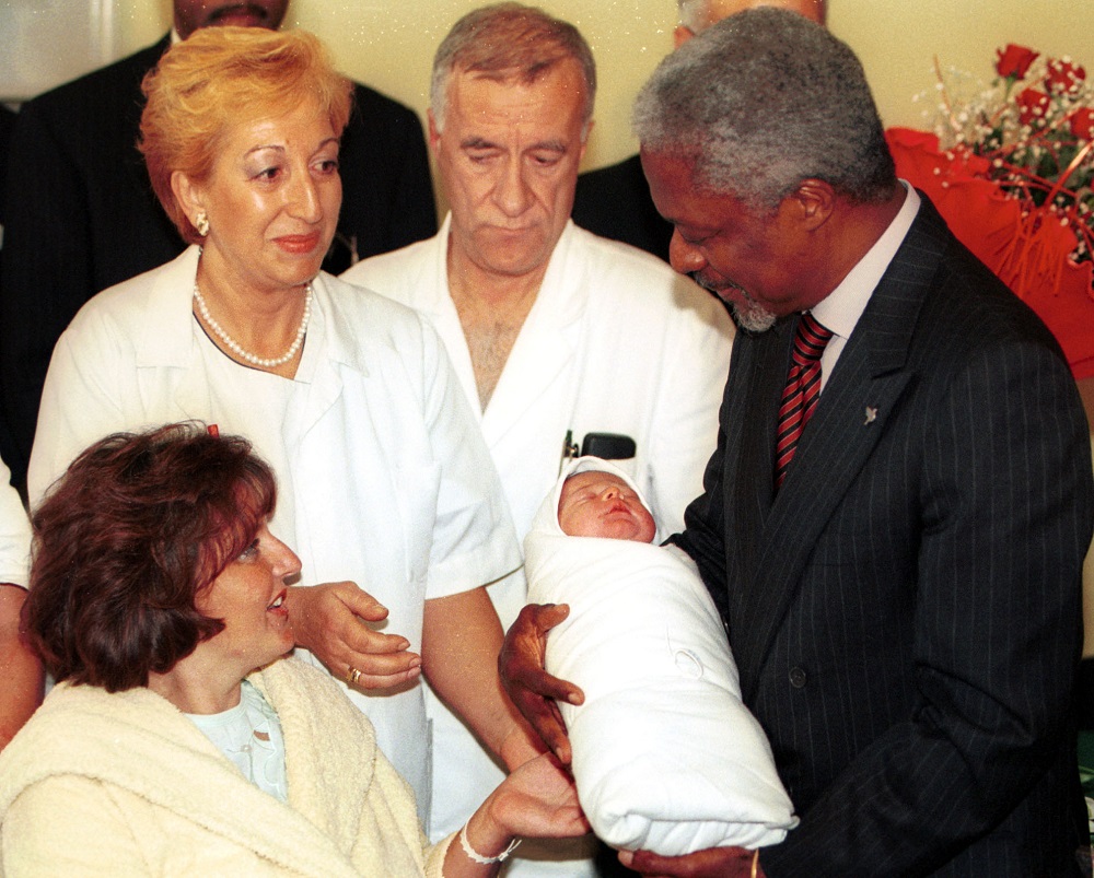 Generálny tajomník OSN Kofi Annan drží na rukách novorodenca Adnana Neviča v prítomnosti jeho matky Fatimy Nevičovej (vľavo dole) 12. októbra 1999 v sarajevskej nemocnici. Malý Adnan sa stal 6-miliardtým obyvateľom našej planéty. Foto - TASR/AP