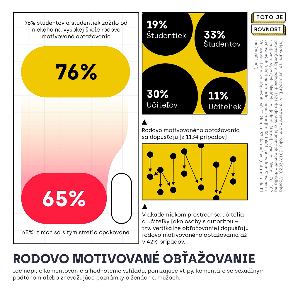 Až 76 percent študentiek a študentov sa počas štúdia na ich súčasnej vysokej škole stretlo s rodovo motivovaným (sexistickým) obťažovaním. Toto zistenie je jedným z výsledkov najnovšieho prieskumu Inštitútu pre výskum práce a rodiny.