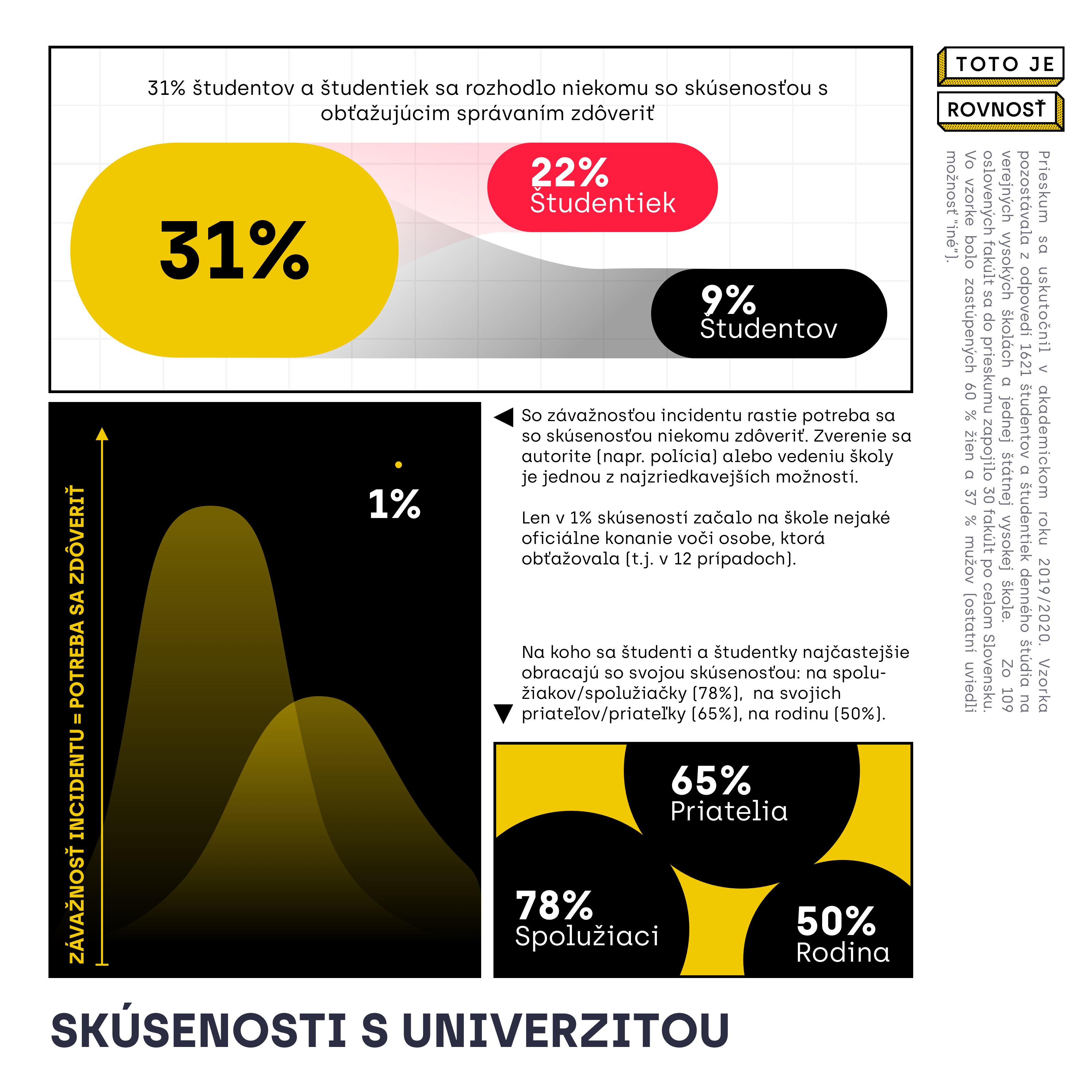 “Jeho pozícia je zabezpečená (...) aj keby sa to začne riešiť, tak škola ho nemôže vyhodiť, lebo by museli zavrieť celý odbor. A na Slovensku nie je nikto iný, kto by ten odbor mohol viesť (...).” (Barbora). Aj skúsenosť s obťažujúcim správaním od rovesníčky či rovesníka (t. j. inej študentky či študenta) môže mať zásadný vplyv na pocit bezpečia, napr. na internáte, či na výsledky štúdia. Študentky a študenti sa vo výskume objavujú ako osoby, ktoré sa dopúšťajú hlavne neželanej sexuálnej pozornosti (v 82 % prípadov z 666) a sexuálneho nátlaku (v 78 % prípadov z 43).