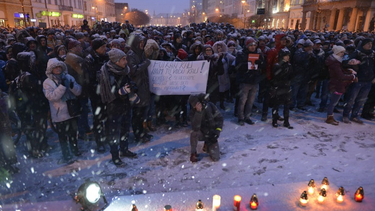 V Košciiach si pamiatku zavraždeného investigatívneho novinára Jána Kuciaka a jeho snúbenice Martiny Kušnírovej uctilo viac ako tisíc ľudí. Už pred začiatkom zhromaždenia zapaľovali ľudia sviečky pri budove Štátnej vedeckej knižnice, na ktorej bol pripevnený plagát a transparent s nápisom "Nezabudneme". Foto - TASR